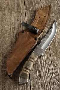 Genau damit kann man spielen. Tatsächlich spielen, indem man nämlich das Kopfkino die Arbeit tun lässt, viel mehr als das tatsächliche Gerät. Deshalb empfehle ich zum Beispiel, das Messer vorzuzeigen, ehe die Maske aufgesetzt wird. Ob es sich dabei um ein solches Jagdmesser handelt wie auf dem Foto (Achtung: diese Messer dürfen in Deutschland zwar in deinem Besitz sein, aber nicht getragen werden!) oder ob du ein Taschenmesser benutzt, kannst du als Dom entscheiden je nach sadistischer Neigung.