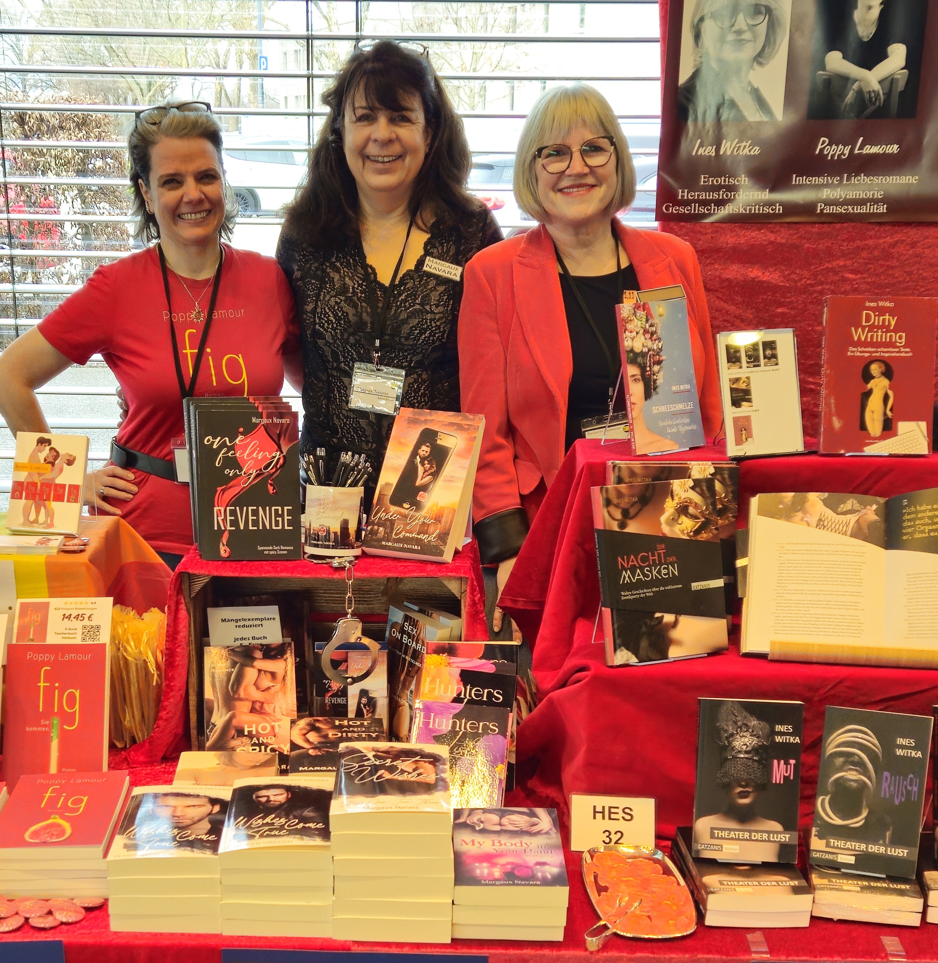 Das Bild zeigt mich mit meinen Kolleginnen Ines Witka und Poppy Lamour bei der ersten Stuttgarter Buchmesse im Februar 2025.